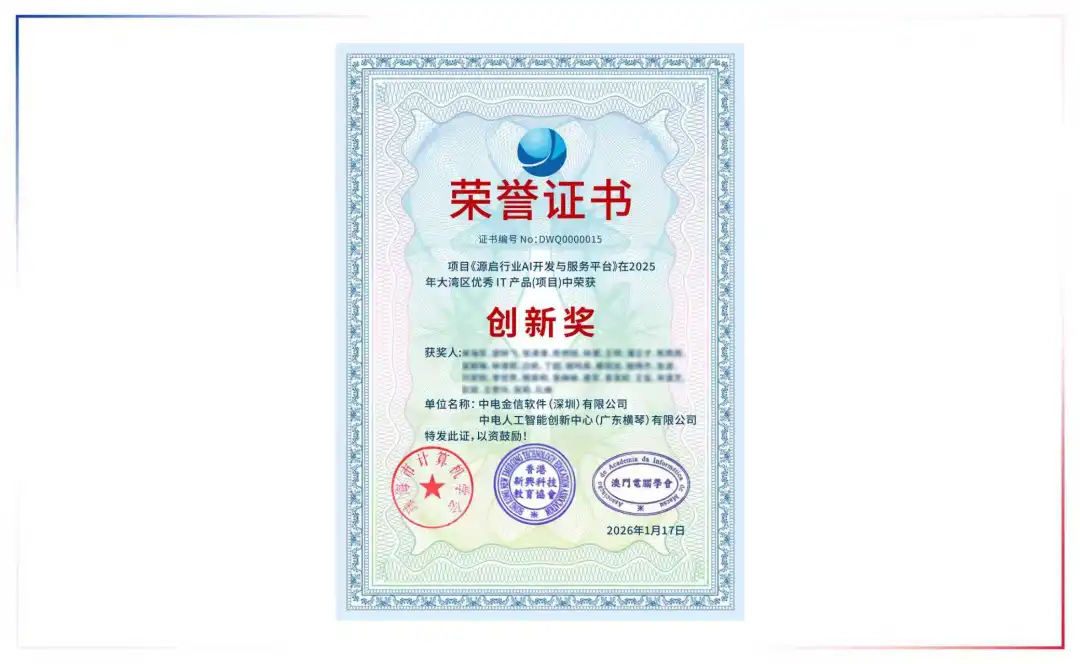 近日,珠海市计算机学会联合香港新兴科技教育协会、澳门电脑学会共同发布“2025年度大湾区珠港澳IT产品(项目)创新奖”。中电金信“源启·行业AI开发与服务平台”凭借领先的技术架构与显著的行业赋能价值,成功荣获该奖项。