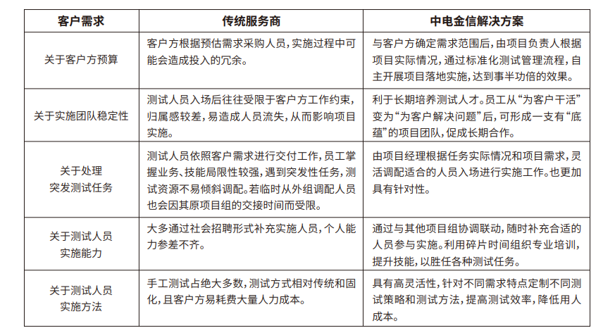 在测试实施层面,中电金信能够覆盖并实施车险业务、非车险业务及其周边系统等所有财险业务的测试项目,根据业务形态以及系统特性,采用功能测试、接口测试以及自动化测试等方式进行质量控制,并站在系统用户角度,将单一业务需求精细化、场景化,以提高测试用例覆盖度,确保系统质量。